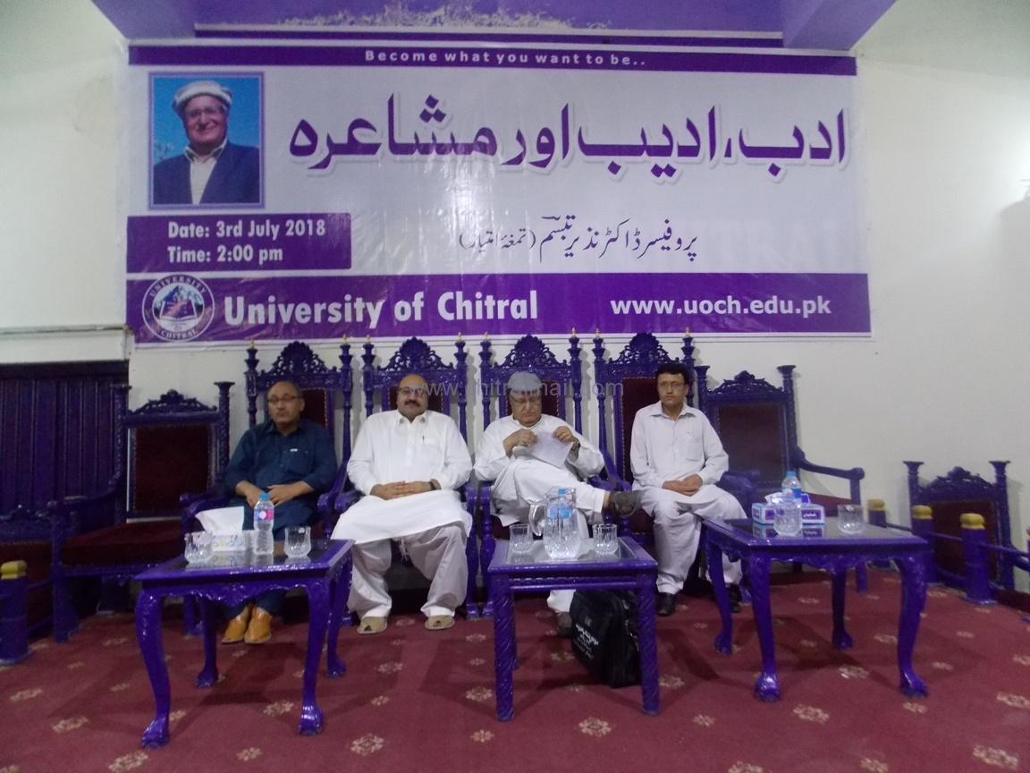 چترال (نمائندہ چترال میل) “ادب، ادیب اور معاشرہ “کے موضوع پر چترال یونیورسٹی میں شعبہ اردو کے زیر اہتمام خصوصی لیکچر منعقد ہوا جس میں اردو کے نامور استاذ، ادیب اور شاعر اورشعبہ اردو پشاور ونیورسٹی کے سابق چیرمین پروفیسر ڈاکٹر نذیر تبسم نے اپنے خیالات کا اظہار کیا۔ انہوں نے بہت ہی لطیف پیرائے میں ادب اور ادیب کا معاشرے کے بناؤ اور اس کی راہ کی تعین میں کردار کو واضح کیااور کہاکہ ادب میں جہاں معاشر ے کی عکاسی ہوتی ہے تو وہاں مستقبل کے حوالے سے جہت کا تعین بھی اس کے زمرے آتی ہے۔ اس موقع پر اردو ادب میں دو معروف شعری مجموعوں “تم اداس مت ہونا”اور “ابھی موسم نہیں بدلا”پر تبصرہ پیش کیا اور کہاکہ اس میں معاشرے کے خدوخال کی نقشہ کشی کرتے ہوئے ادب اور معاشرے کے درمیاں رشتے کو واضح کردیا ہے۔ پروفیسر نذیر تبسم نے اس امید کا اظہار کیا کہ چترال یونیورسٹی کا شعبہ اردو ادیبوں اور شاعروں کاتعلق معاشرے سے جوڑنے اور ان کی تربیت و رہنمائی میں نمایان کردار سرانجام دے گا۔ چترال یونیورسٹی کے پراجیکٹ ڈائرکٹر پروفیسر ڈاکٹر بادشاہ منیر بخاری نے اس موقع پر اپنے خطاب میں چترال کا دورہ کرنے پر پروفیسر نذیر تبسم کا شکریہ ادا کرتے ہوئے کہاکہ ان کے پائے کا شاعر اور ادیب کا چترال یونیورسٹی میں آمد باعث فخر ہے۔ا نہوں نے چترال کی مقامی ادب کے تناظر میں ادیب اور معاشرے کے درمیان تعلق پر روشنی ڈالی اور کہا کہ گزشتہ کئی دہائی سالوں میں یہاں پر جمع شدہ ادبی شہ پارے اپنی معیار میں کسی طور پر بھی کم نہیں ہے۔ انہوں نے کہاکہ چترال یونیورسٹی نے بہت ہی مختصر عرصے میں طلباء طالبات کو جدید دور سے روشناس کرانے کے لئے بین الاقوامی، قومی اور علاقائی سطح پر کئی کانفرنسوں کا کامیاب انعقاد کیا ہے اور آج کا لیکچر بھی اسی کا ایک تسلسل ہے۔ شعبہ اردو کے چیرمین پروفیسر صاحب خان اور پرووسٹ ڈاکٹر تاج الدین اور پی آر او شکیل احمد بھی اس موقع پر موجود تھے۔