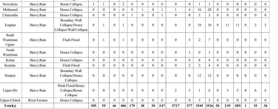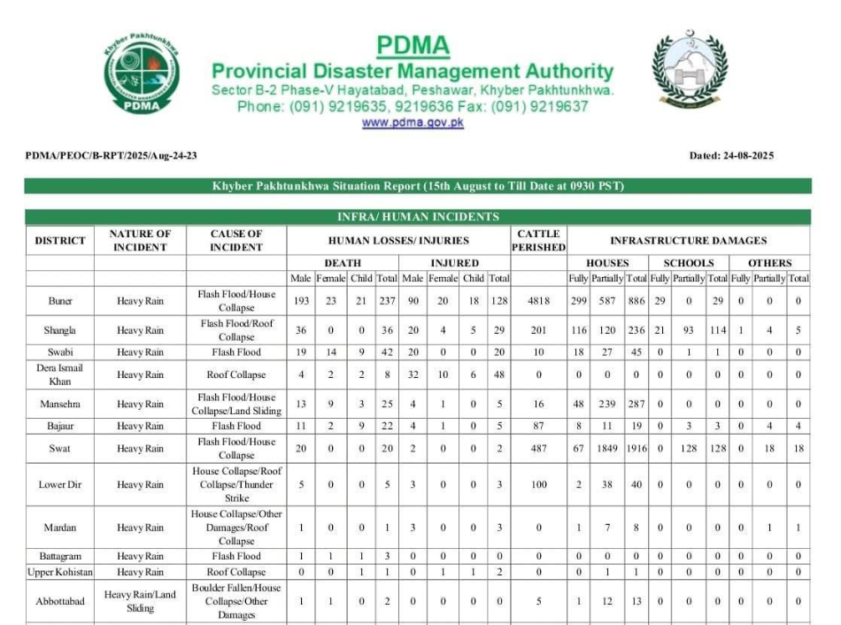سیلاب سے زیادہ متاثرہ ضلع بونیر میں اب تک مجموعی طور پر جابحق افراد کی تعداد 337 اور صوابی میں 46 ہو گئی۔ یہ حادثات صوبہ کے مختلف اضلاع سوات، بونیر، باجوڑ، مانسہرہ، شانگلہ, دیر لویر اور بٹگرام، ڈی آئی خان اور صوابی میں پیش آئے۔