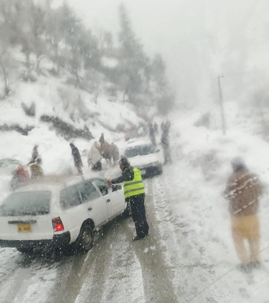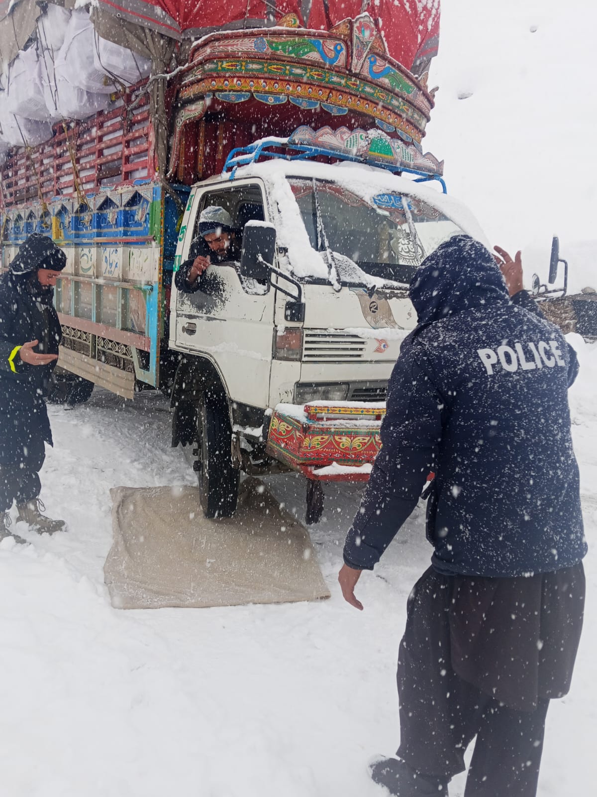 شدید برفباری اور سخت موسمی حالات میں لوئر چترال پولیس کے جوان ٹریفک پولیس وارڈنز کے ہمراہ لواری ٹنل میں پھسی ہوئی گاڑیوں کو ریسکیو کر رہے ہیں اور مسافروں کو محفوظ مقامات پر پہنچانے میں مصروف ہیں۔