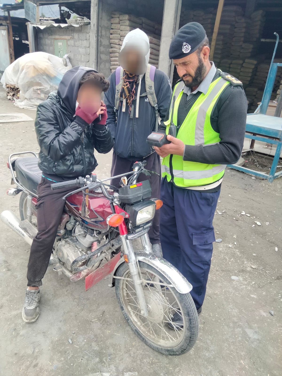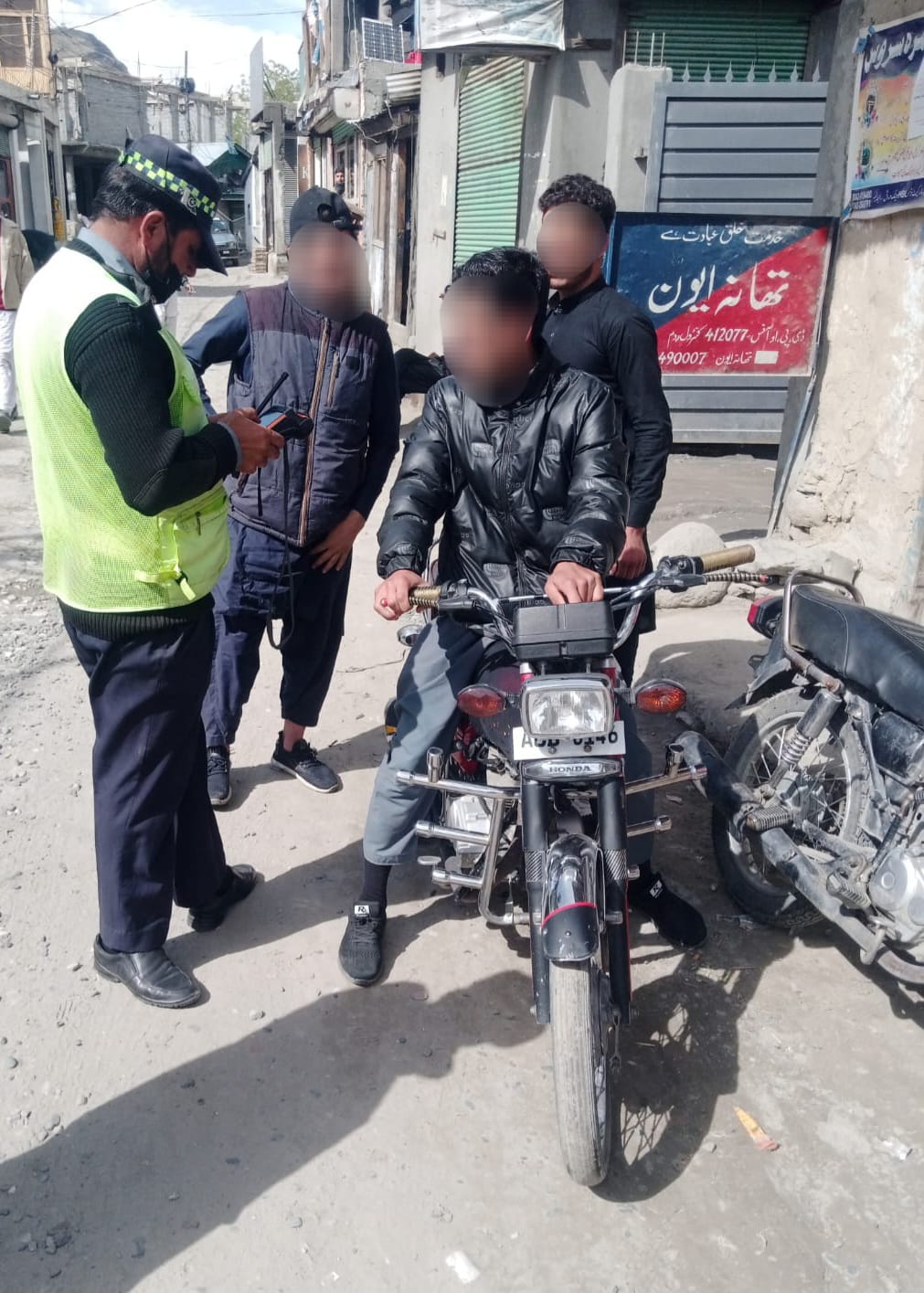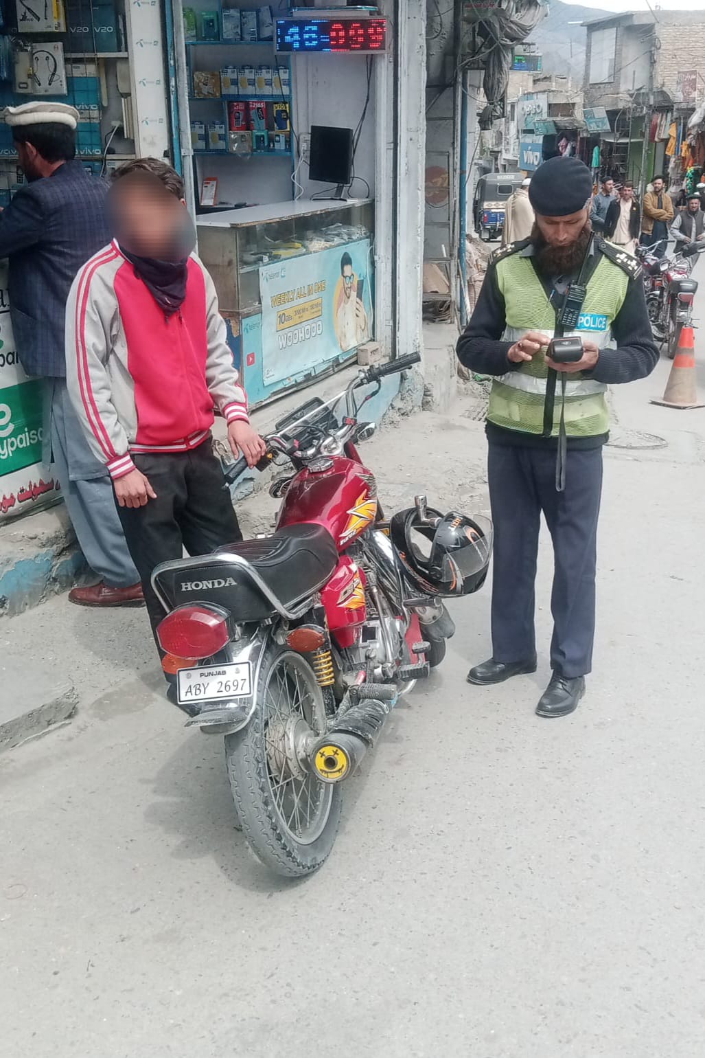 انچارچ ٹریفک وارڈن پولیس SI عادل احمد بیگ کی سربراہی میں ٹریفک وارڈنز نے مختلف مقامات پر ناکہ بندی کرکے متعدد کم سن رائیڈرز کو ٹریفک قوانین کی خلاف ورزی کرنے پر چالان کیا۔