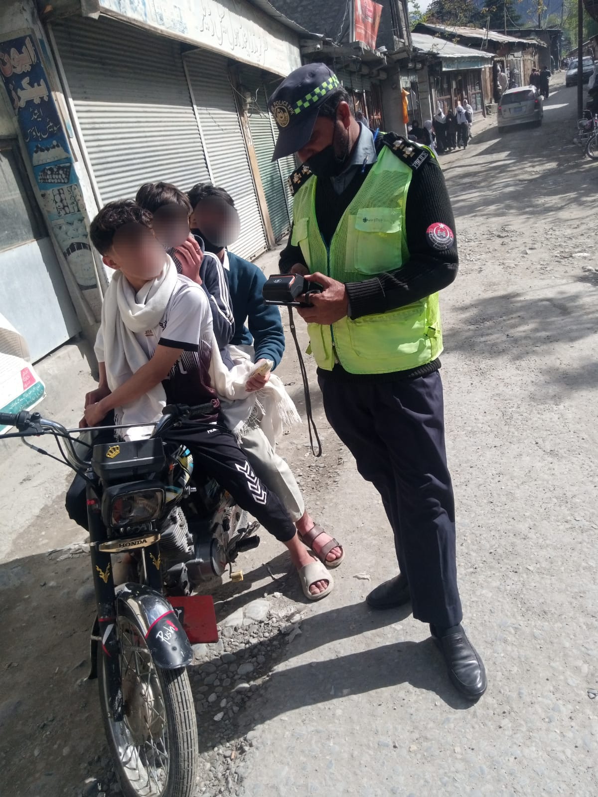 ڈسٹرکٹ پولیس آفیسر لوئر چترال رفعت اللہ خان کی خصوصی احکامات پر لوئر چترال میں ممکنہ ٹریفک حادثات کی روک تھام کے خاطر کم سن موٹرسائکلسٹ کے خلاف کارروائیوں کا سلسلہ جاری ہے۔